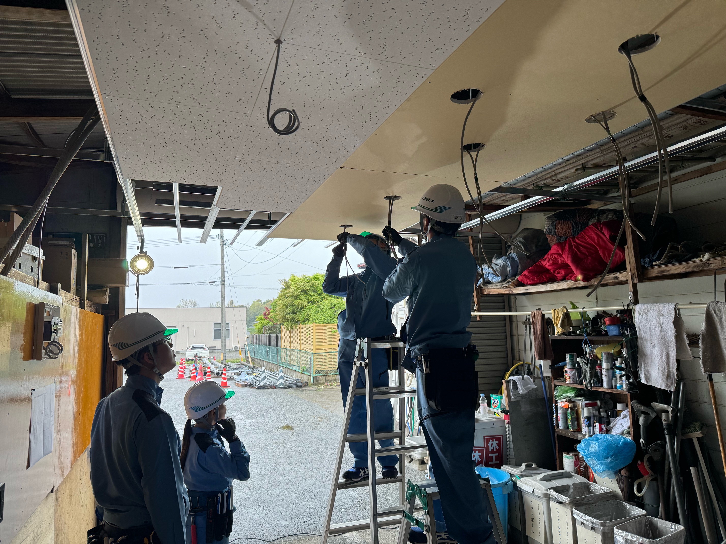 (恐らく初めて触れる工具を使用し、天井開口・配線・ダウンライト取付・スイッチ取付を行ってもらいました。)